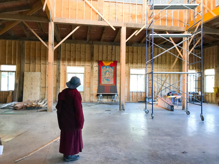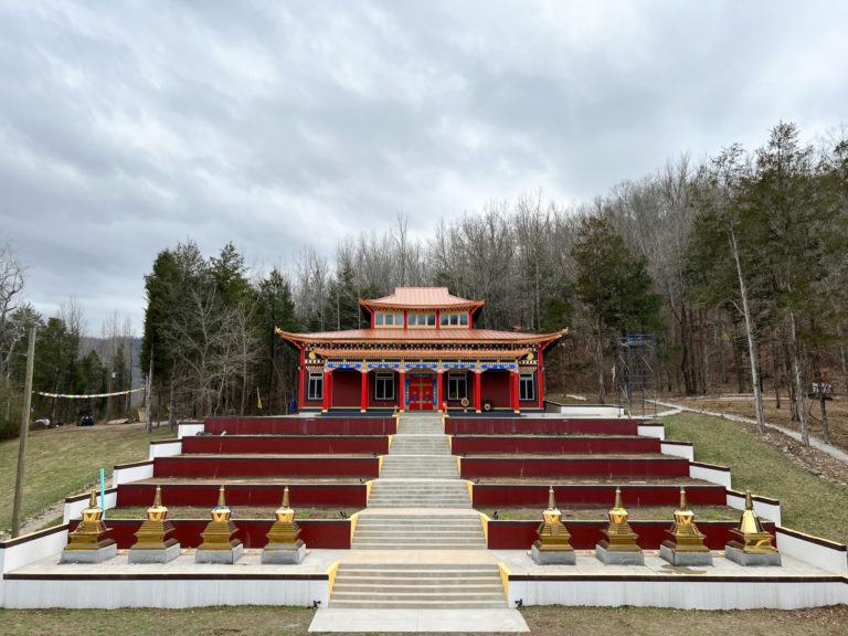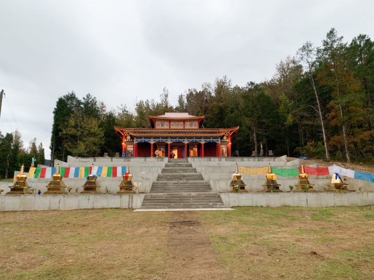 In 2016, Khentrul Rinpoche was walking the land with a student when they reached an area on the hillside overlooking the main grounds. Rinpoche knew it was a perfect location for the temple, so that same year we broke ground and began construction. Several of Khentrul Rinpoche’s skilled students have worked to design, construct, and create the artwork for the temple.