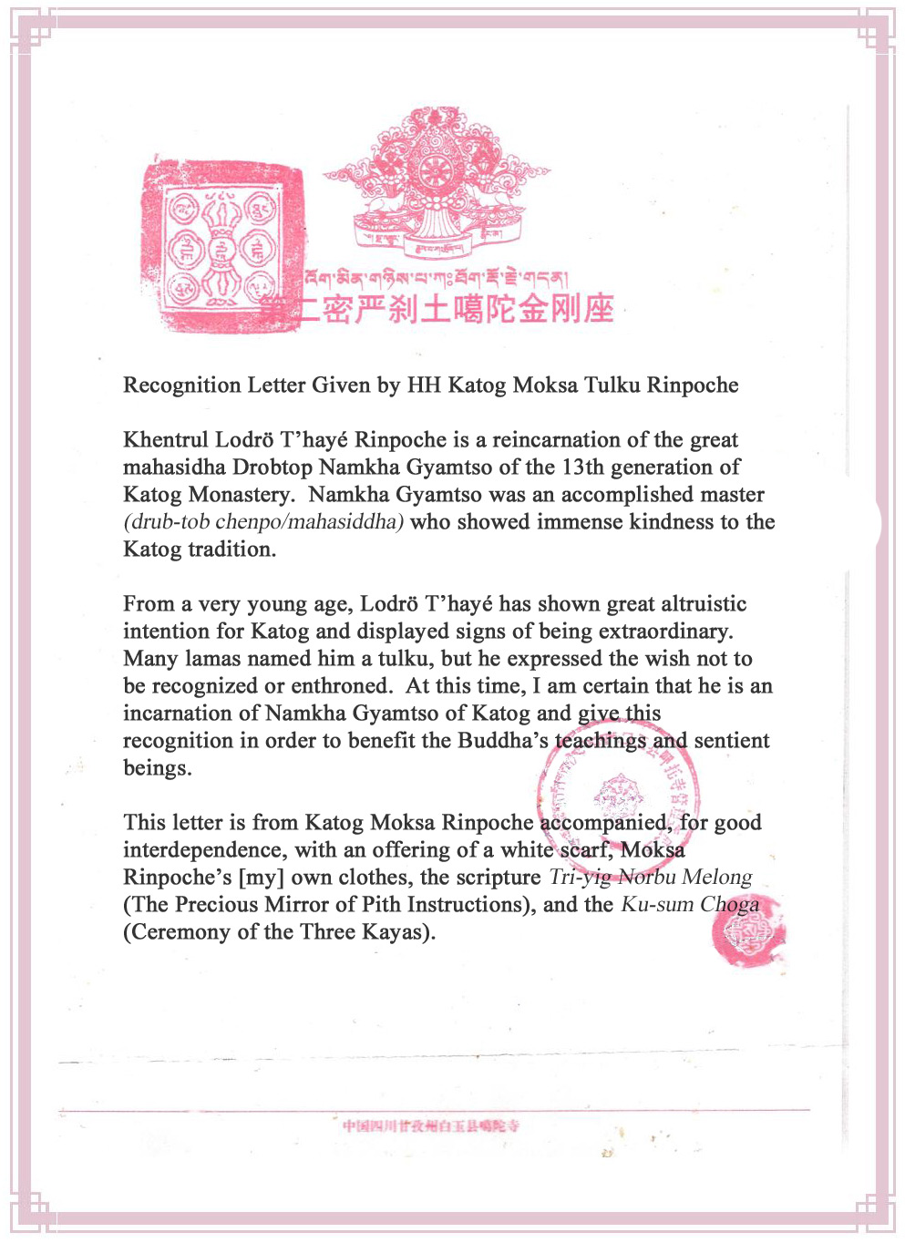H.H. Katog Moktsa Rinpoche enthroned Rinpoche at Katog Dorje Den, the mother monastery of the Katog lineage in Tibet, as a reincarnate master (tulku) of Drubtop Namkha Gyamtso, a renowned siddha of this lineage. In addition, he had also been recognized at a very young age by his uncle, Terton Jigme Dorje, to be the reincarnation of Katog Chagtsa Tulku. Khentrul Rinpoche has never used his tulku recognition names, preferring to establish himself as a teacher through his own qualities of personal study, practice, and example. However, to create good interdependence, he has used the title Khentrul, which means both a khenpo and a tulku.