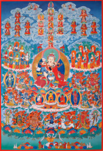 The Nyingma maintains both lay and monastic traditions, with six mother monasteries: Dorje Drak and Mindroling in central Tibet, as well as Katog, Palyul, Dzogchen, and Shechen in eastern Tibet (Kham). There are too many great masters and principal figures in this tradition to enumerate here, but a few seminal figures include Longchenpa, Jigme Lingpa, Chogyur Lingpa, Patrul Rinpoche, Ju Mipham Rinpoche, and Khentrul Rinpoche’s root guru, His Holiness Jigme Phuntsok Rinpoche, among others. For more information see the Treasury of Lives website..